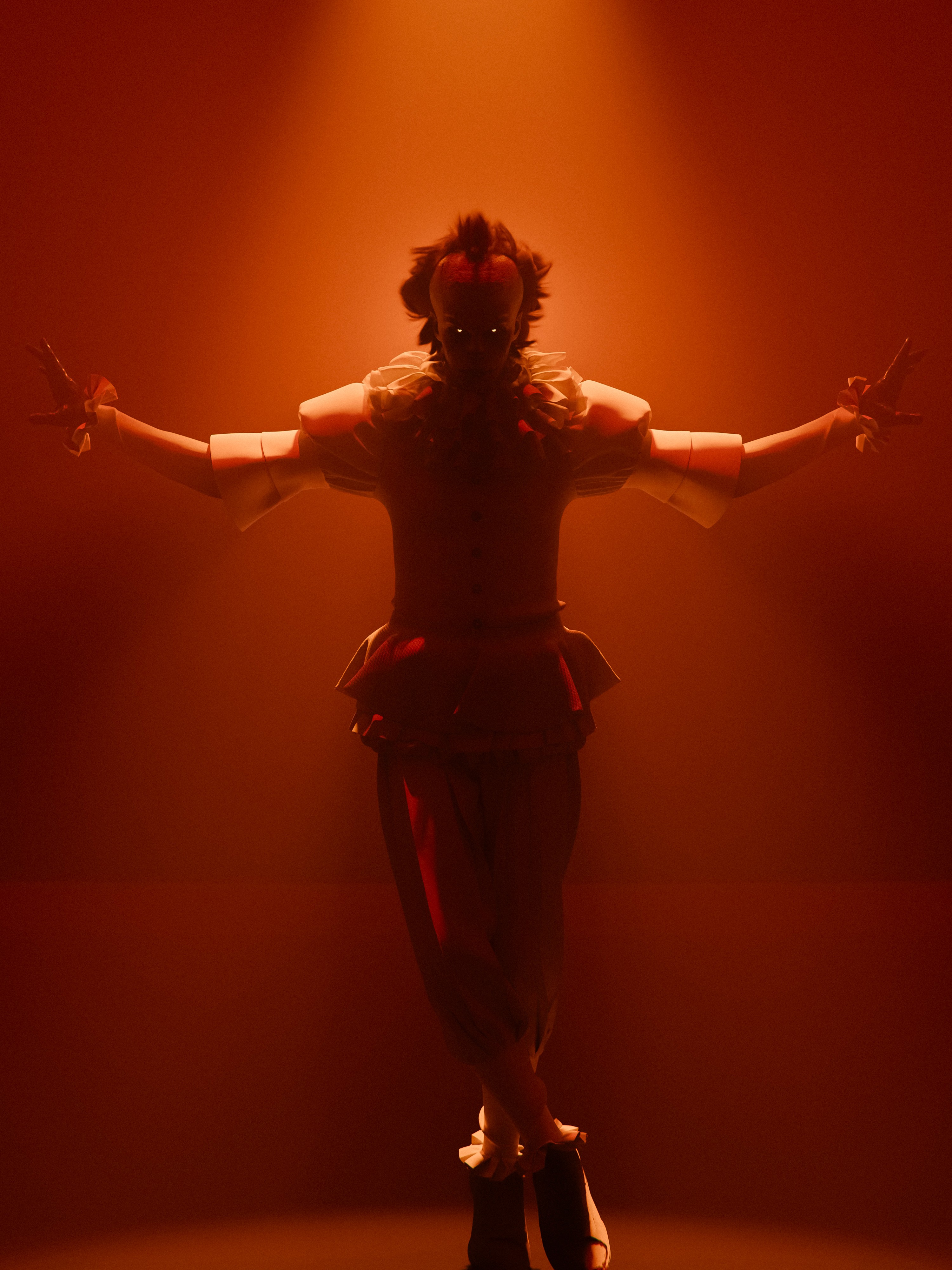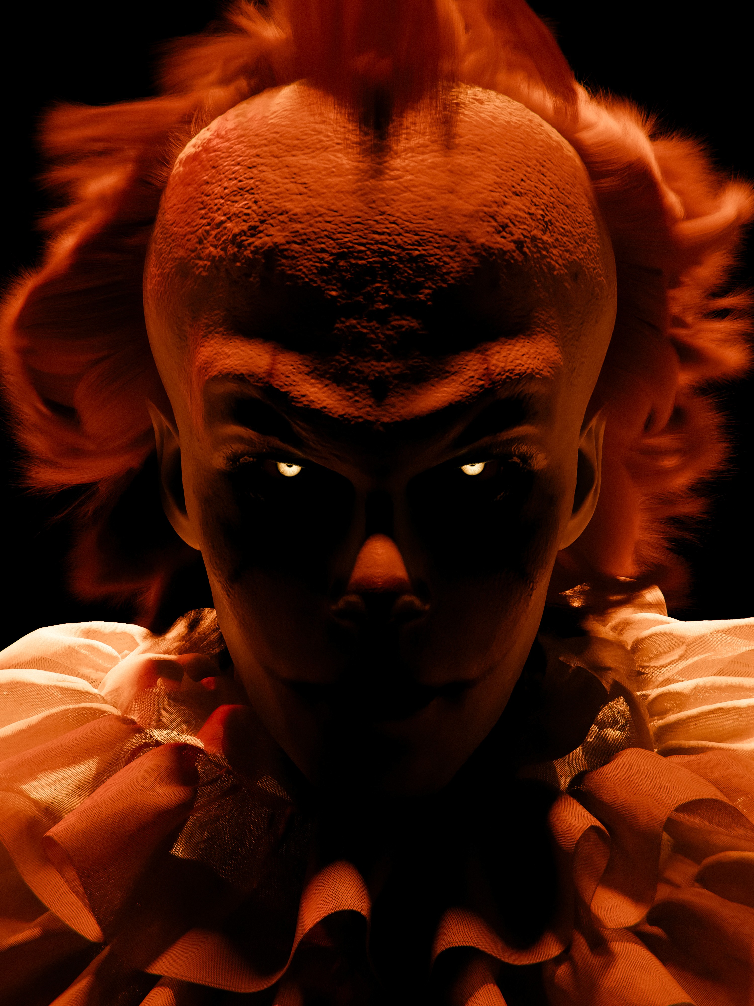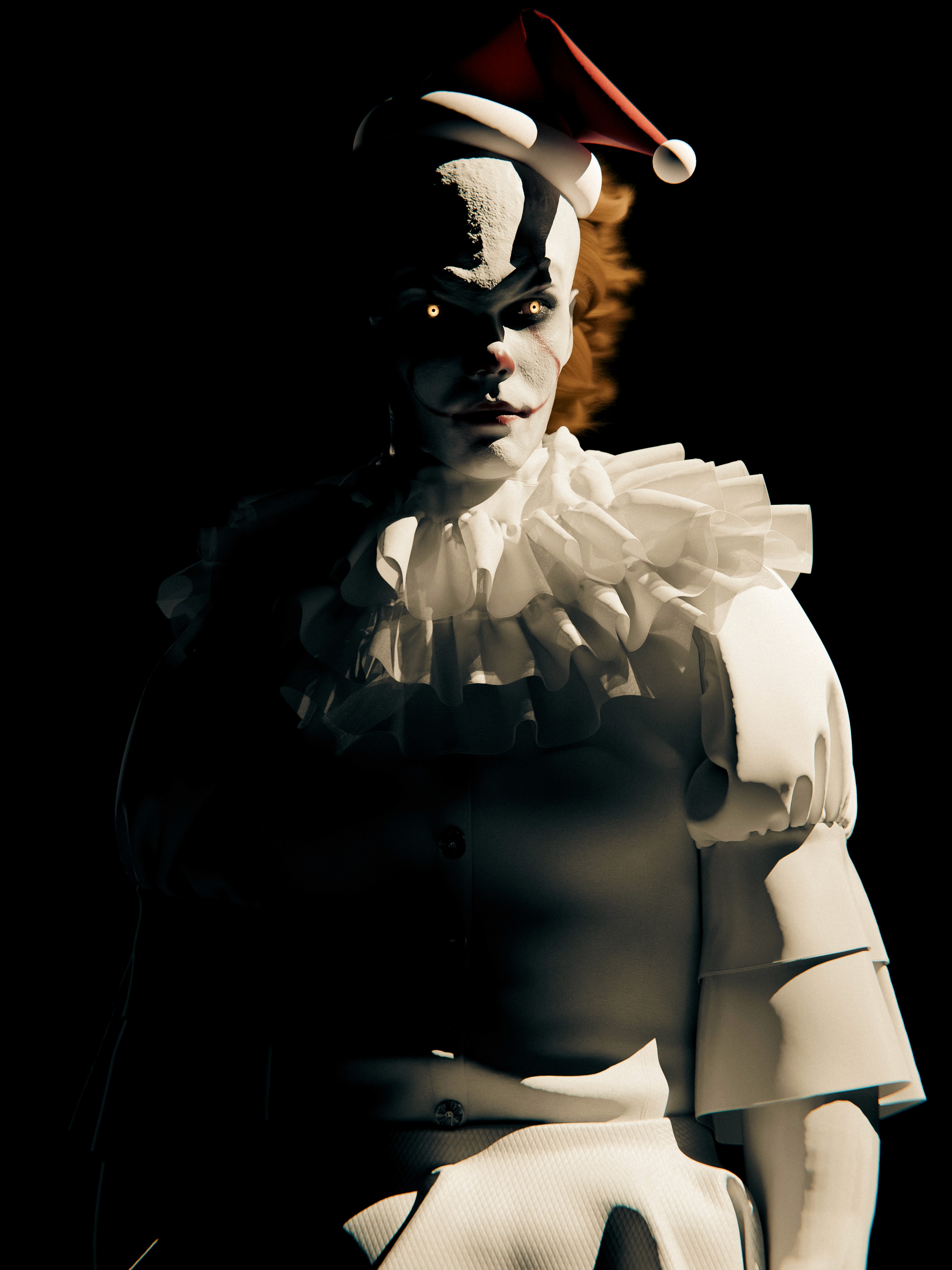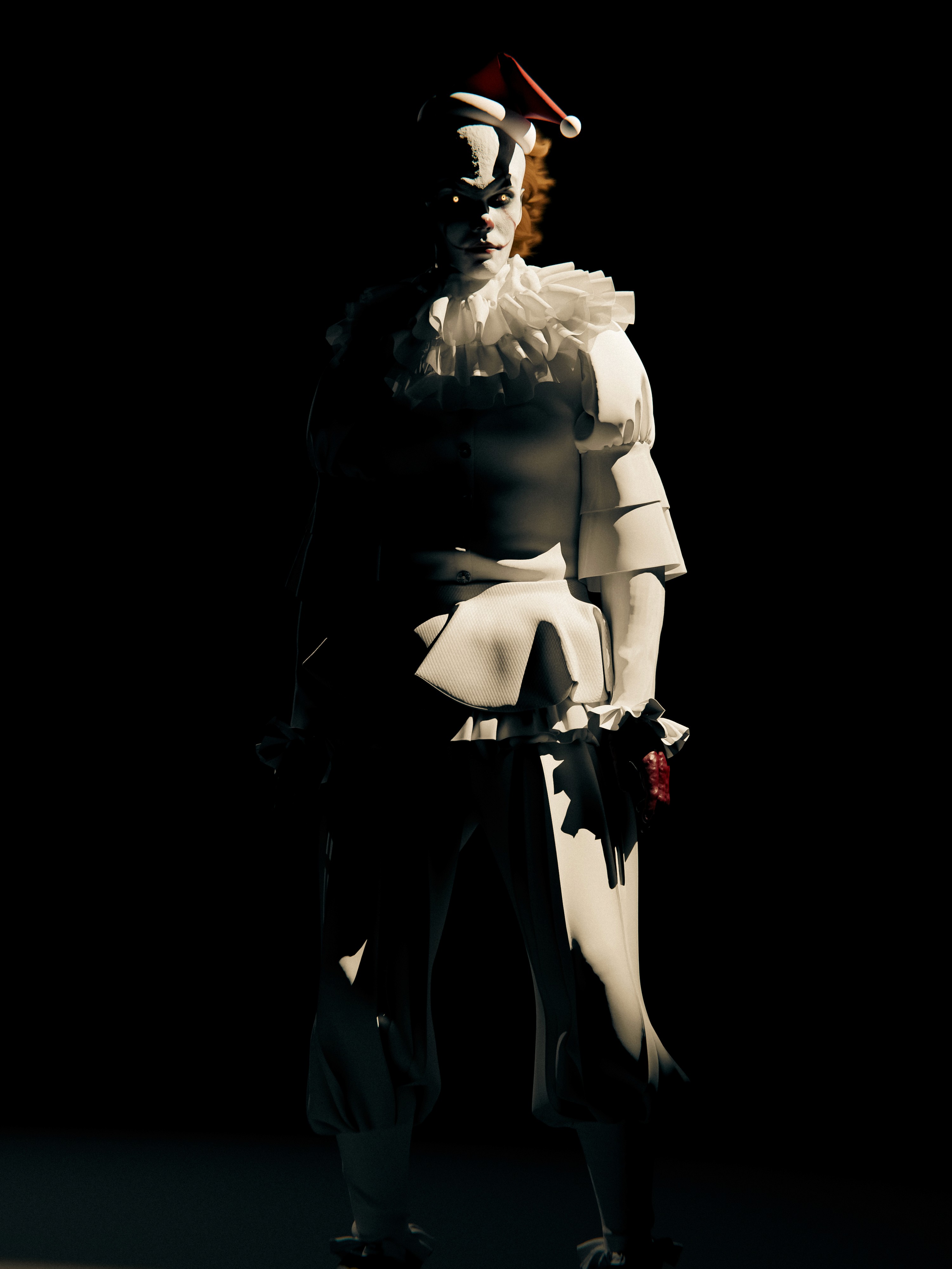 made pennywise, face sculpted on zbrush, clothes made on clo3d, lighting and rendering on blender, makeup drawn on substance painter